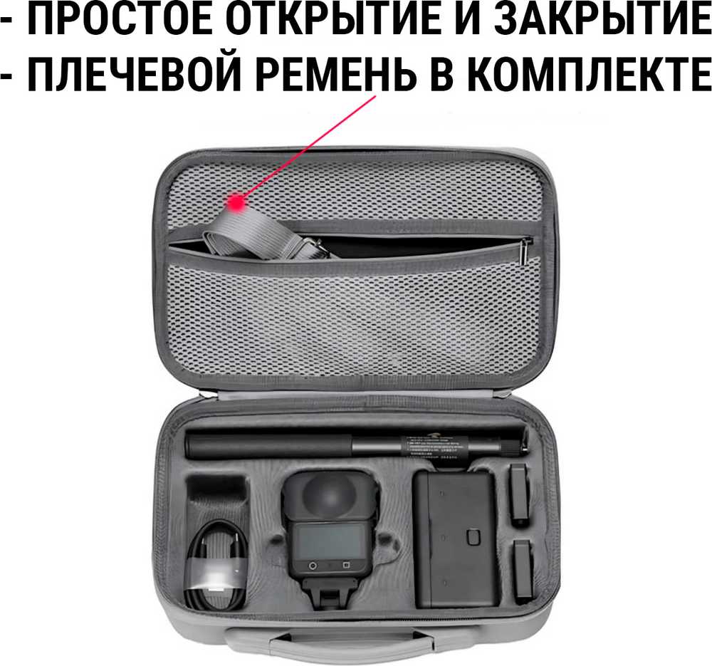 Этот кейс служит для безопасного хранения и удобной транспортировки камеры DJI Osmo 360 Adventure Combo с аксессуарами. Он защищает комплект от механических ударов, вибраций, случайных падений, пыли и влаги — что особенно важно при съемках в экспедициях, походах и экстремальных условиях.