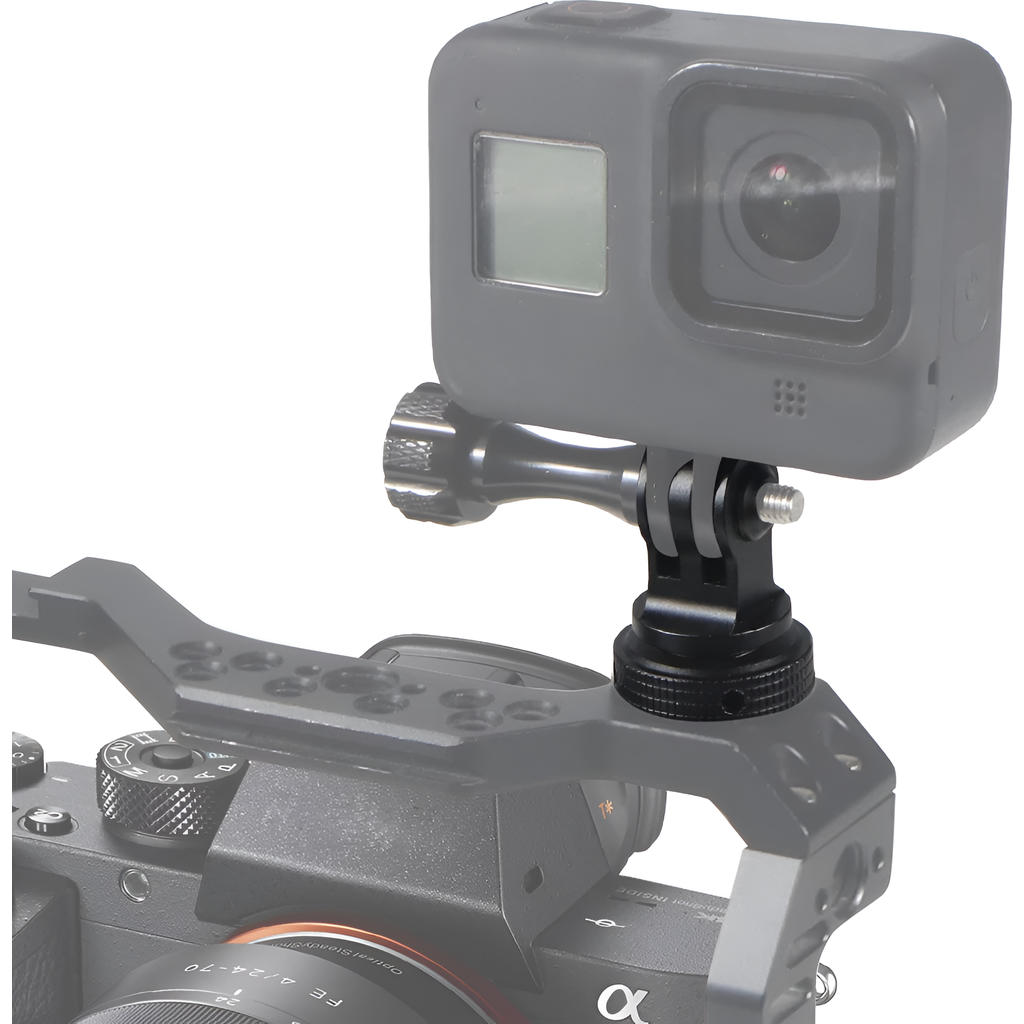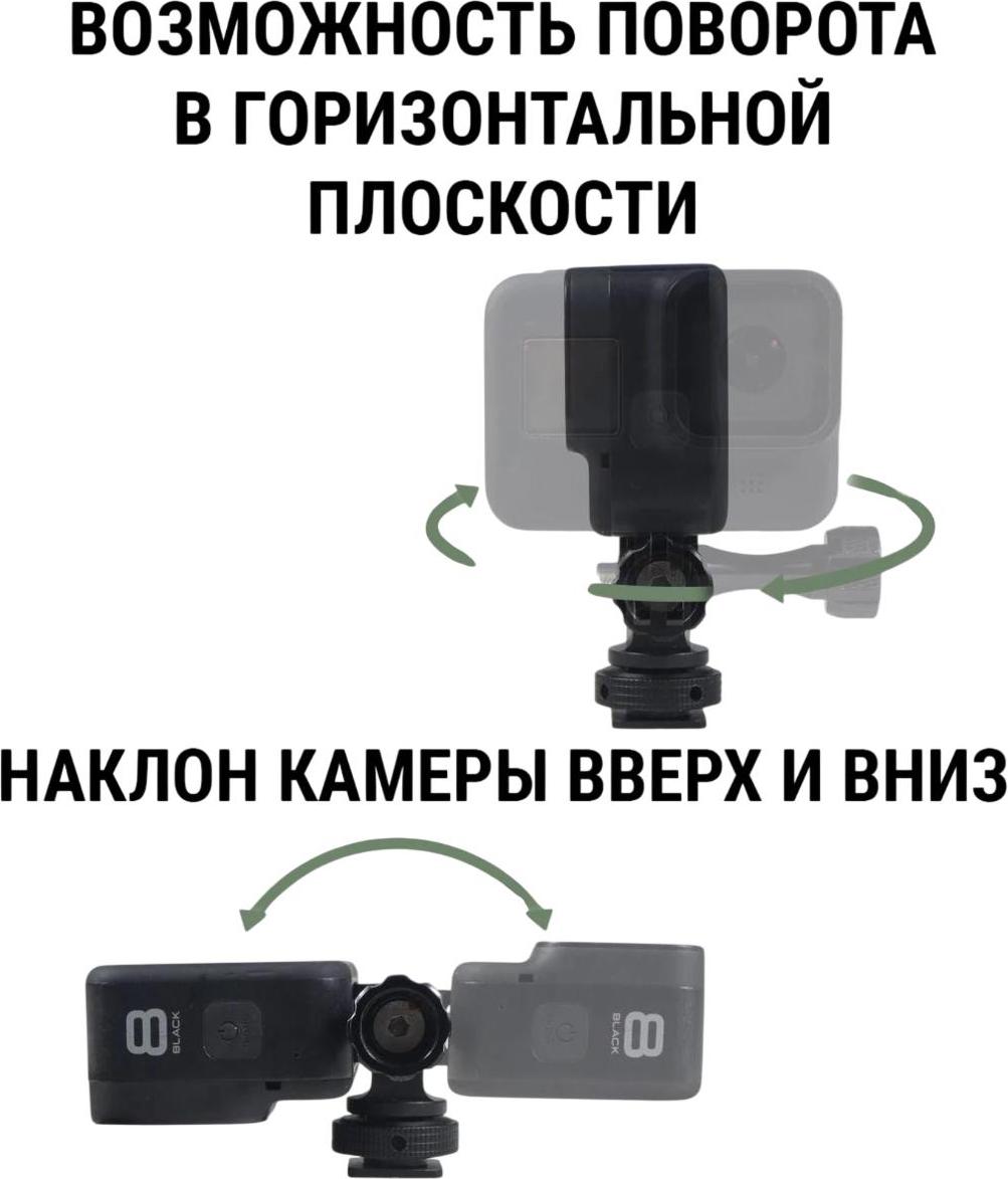 Крепление Zarrumi HSM для экшн-камер выполнено из прочного металлического сплава. Оснащено GoPro Mount, резьбой 1/4" и холодным башмаком.