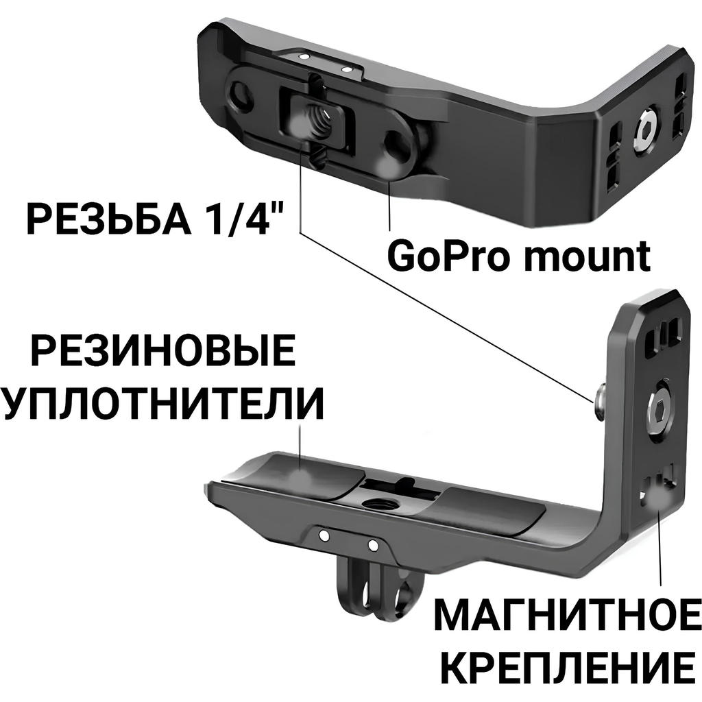 - Наличие магнитного крепления, GoPro Mount и резьбы 1/4 дюйма делают данный адаптер универсальным крепежом, позволяющим устанавливать камеру куда угодно.