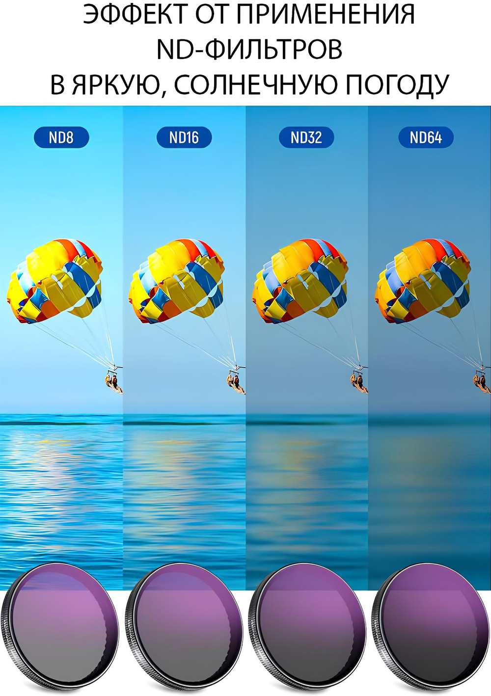- Советы: используйте фильтр ND16 — при съемке в "золотой" или "синий" час, ND32 — для дневной съемки, ND64 — в яркий солнечный день.