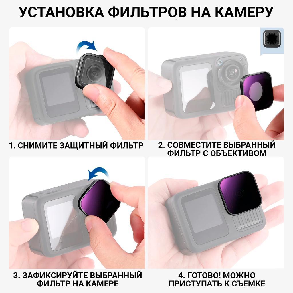 - Светофильтры легко и просто установить на камеру - необходимо снять стандартную защитную линзу и установить необходимый светофильтр.