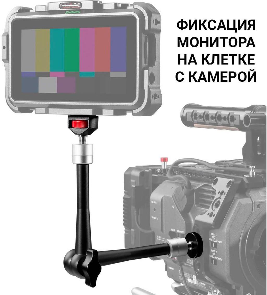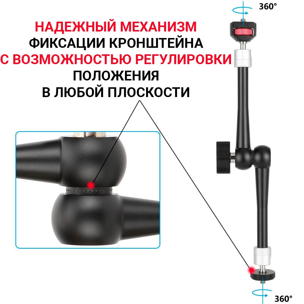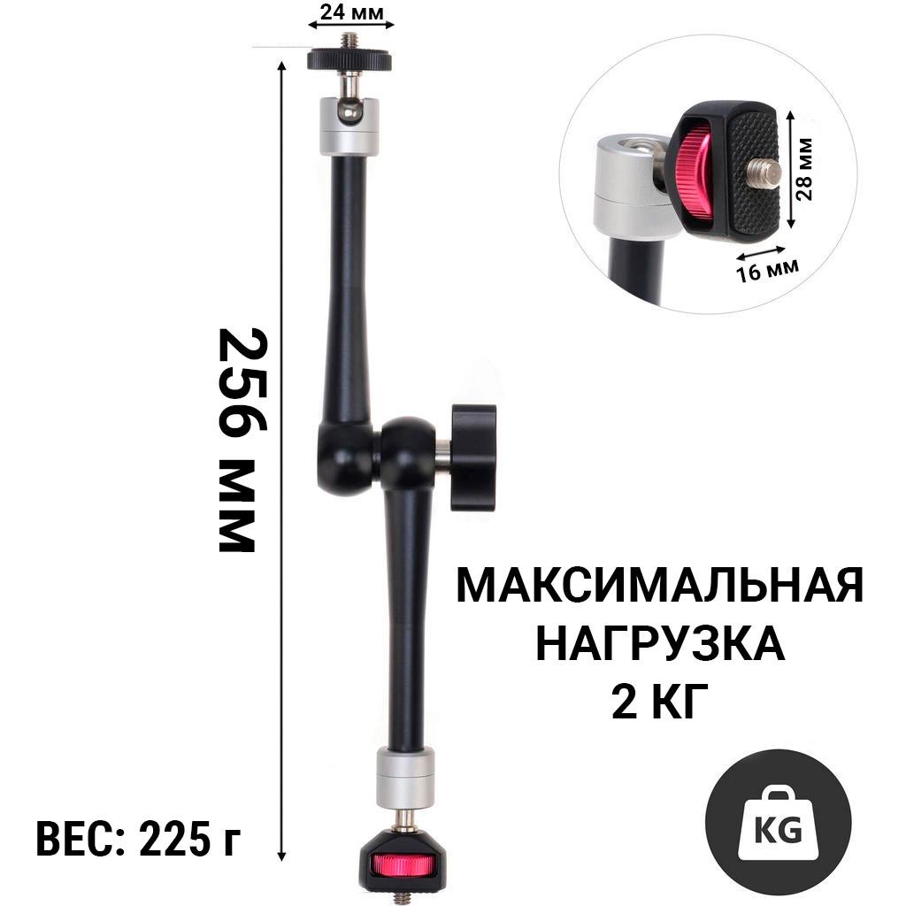 - Zarrumi Magic Arm 11 II имеет общую длину 256 мм (длина одного колена - 128 мм), способен вращаться на 360 градусов в любой плоскости для удобства установки на него любого девайса - клетки, LED-панели, микрофона, видеомонитора, внешнего powerbank`а, смартфона, а также любого другого оборудования весом до 2 кг (в статическом положении).