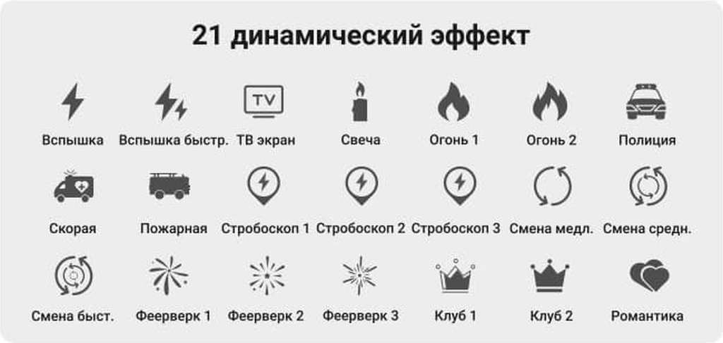 - 28 предустановленных эффектов: Разнообразные световые сценарии, включая динамические и статические эффекты, для создания кинематографичных сцен и креативного контента.