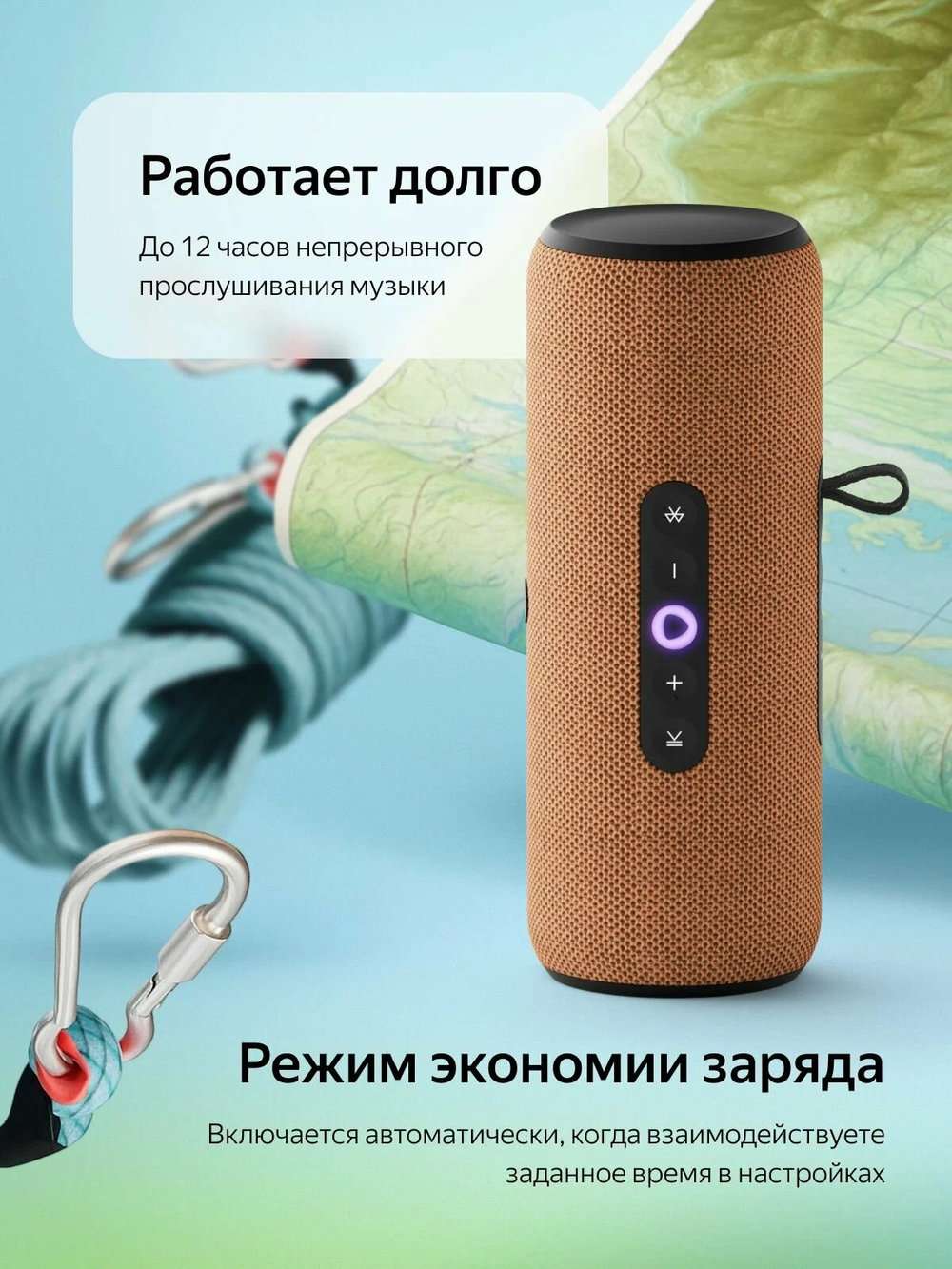 - Высокий класс защиты IP67 делает колонку устойчивой к пыли и воде. Ткань приглушённых цветов не выгорает на солнце. В случае попадания воды в зарядный разъём, Алиса напомнит просушить устройство.