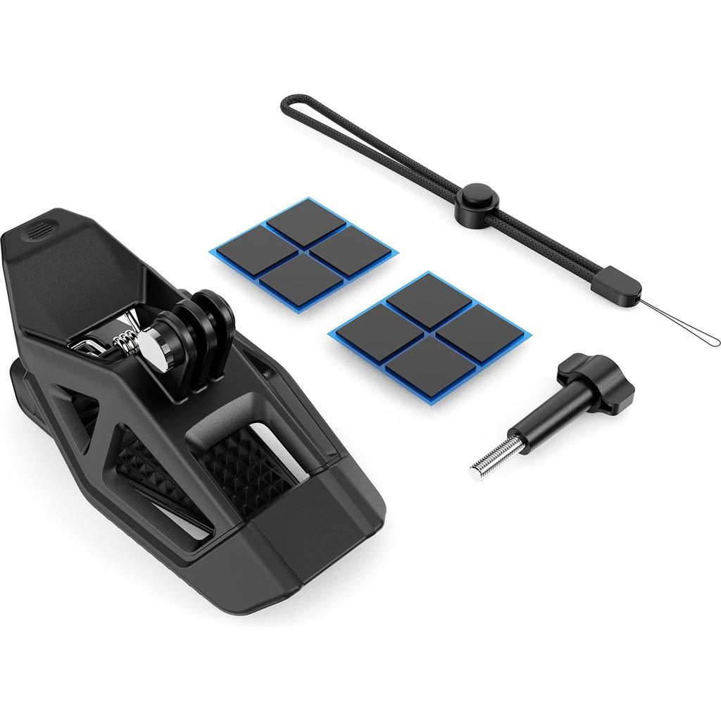 - Надёжная фиксация — крепление фиксируется на шлеме прочно и устойчиво, благодаря чему камера остаётся на месте даже при вибрации, тряске или движении.