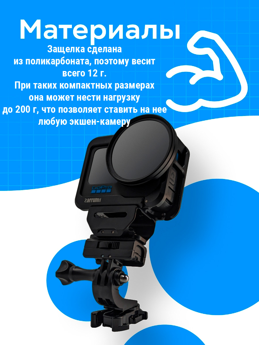 Крепление изготовлено из прочного композитного материала, устойчивого к ударам, вибрациям и погодным условиям. Форма защёлки обеспечивает быстрый монтаж и демонтаж, а фиксация остаётся надежной даже при динамичной съемке, спорте или активном отдыхе.