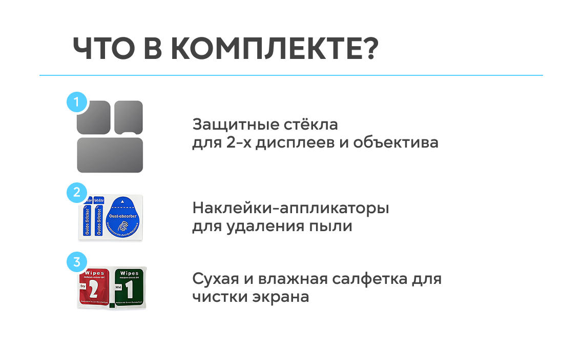 Стекла легко и надежно наклеиваются, благодаря точной геометрии и размерам, поэтому особых навыков по их монтажу не требуется. Просто перед установкой очистите поверхности дисплеев и объектива.